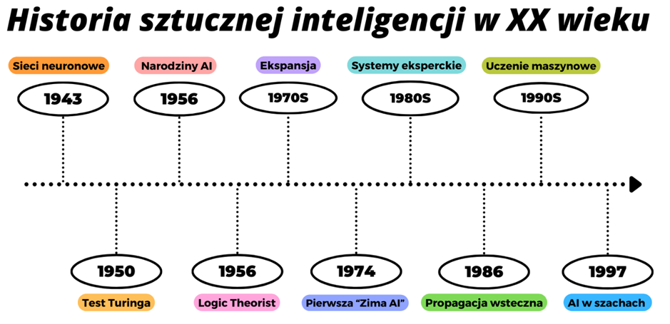 Zrozumienie tej ewolucji pozwala nie tylko lepiej ocenić aktualny stan sztucznej inteligencji, ale też dostrzec, jak głęboko zakorzenione są dzisiejsze wyzwania w długim i często zaskakującym procesie jej rozwoju. Dla większej przejrzystości historię AI podzielono tutaj na dwie części: XX wiek – jako czas narodzin idei i pierwszych eksperymentów – oraz XXI wiek, w którym sztuczna inteligencja zaczęła realnie wpływać na codzienne życie.
